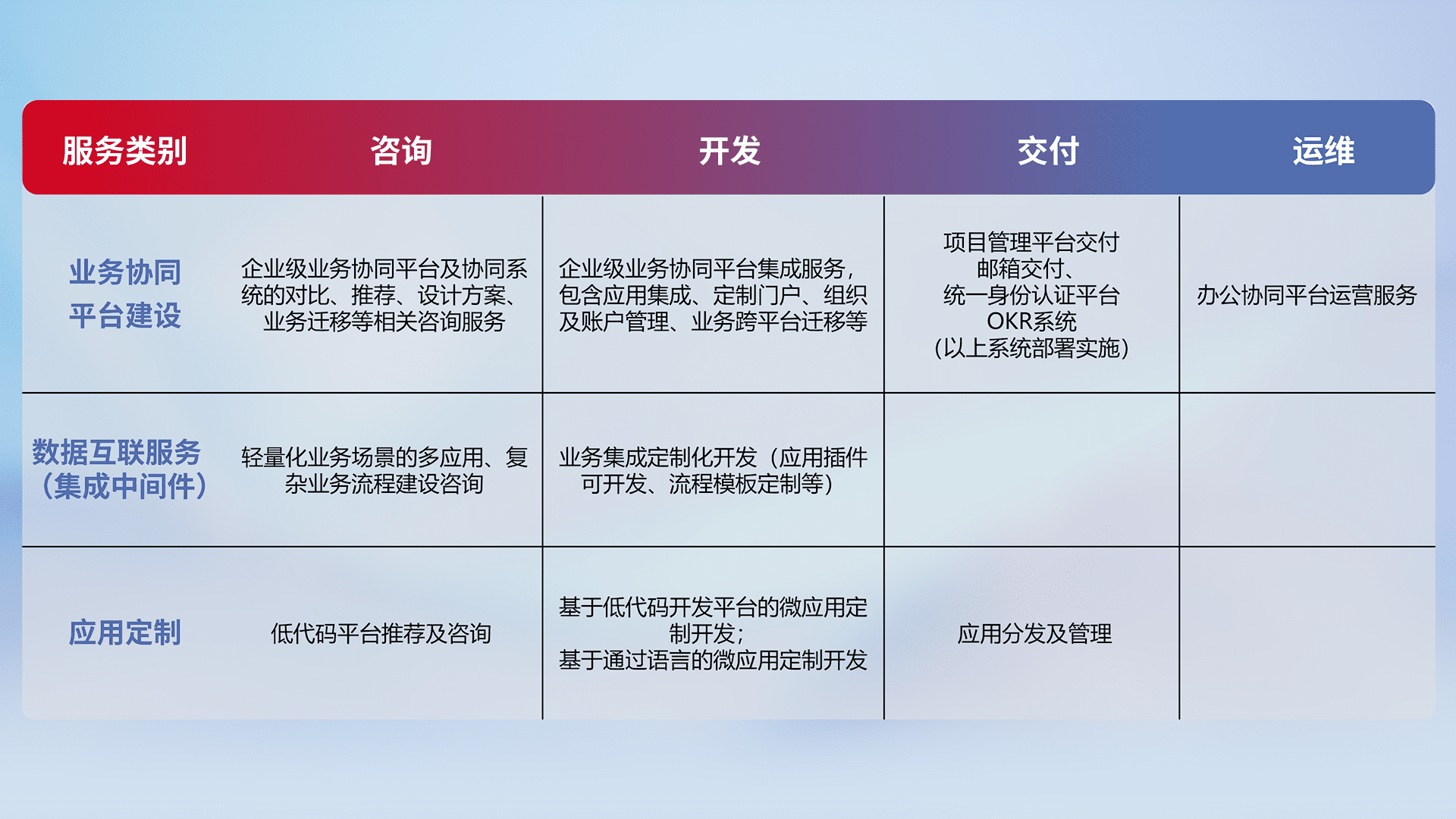 针对钉钉、、、、企微、、、、IDaas等平台级产品提供产品的规划、、方案、、、、交付、、定制化开发等服务,,实现如统一协同办公、、、智能客户服务、、混合会议管理、、、、智能数据查询、、等业务场景,,实现数字化转型。。。