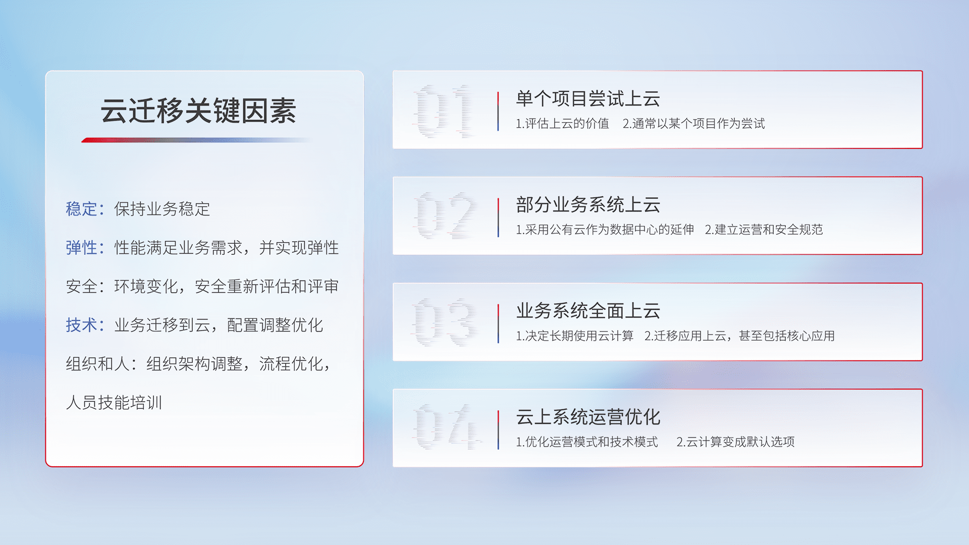 结合实际业务,,,从规划设计、、、云平台选型、、、、云原生改造、、、数据迁移、、、、集成交付,,迁移全过程为客户识别最佳上云路径,,,,做好风险识别管理,,,设计网络架构、、、身份权限、、、、安全审计合规、、、操作审计、、、、日志审计、、、监控告警策略、、、、多站点容灾设计等,,,对云上基础设施进行整体规划,,提升IT治理水平,,,,以满足弹性、、、高可用、、高性能的需求。。。