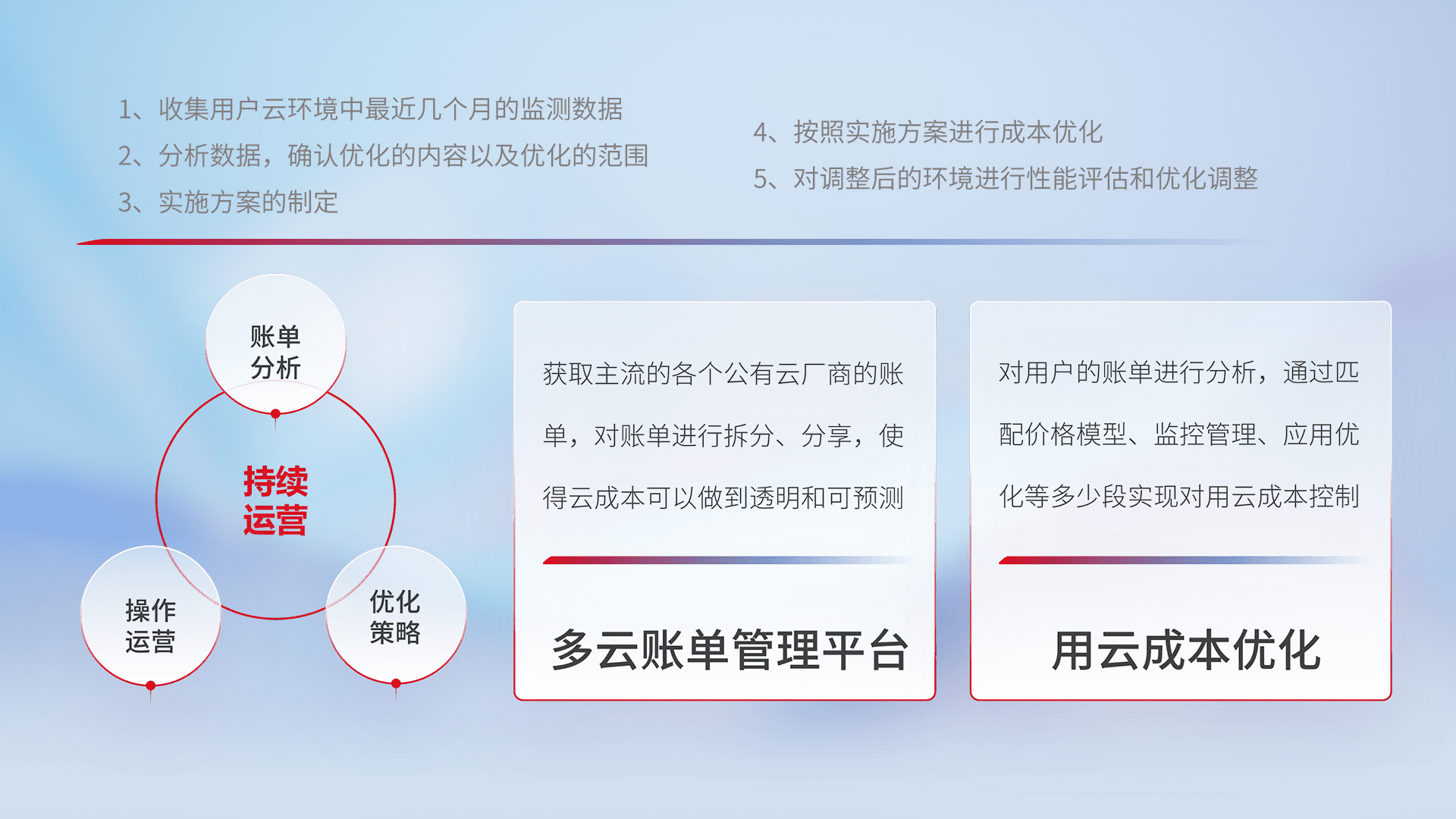 通过多云纳管,,以统一的资源数据模型把客户的云资源进行抽象和封装,,进而实现对多云资源的统一操作,,,保障云资源管理的可靠性、、稳定性与可用性。。。量身定制化运维内容,,,,配置、、开发运维、、补丁管理、、、备份、、、、监控、、、认证和访问管理、、、审计和日常巡检等,,,保障在用云过程中的可靠度,,,稳定度以及高可用率。。。